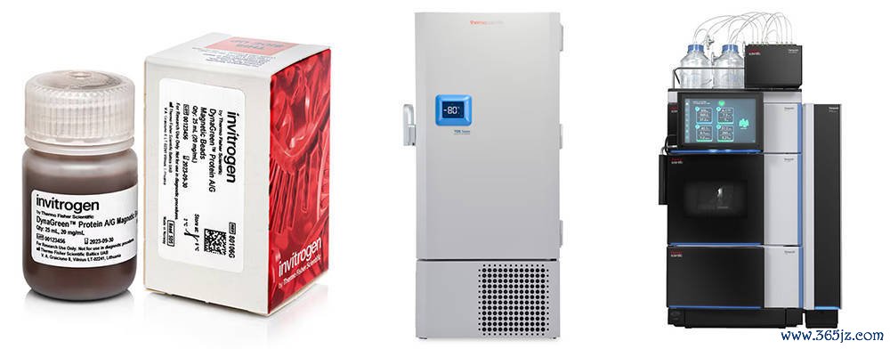 图:从左至右依次是Invitrogen DynaGreen Protein AG 磁珠、Thermo Scientific TDE r系列超低温卧式冰箱以及Thermo Scientific Vanquish Core HPLC 系统